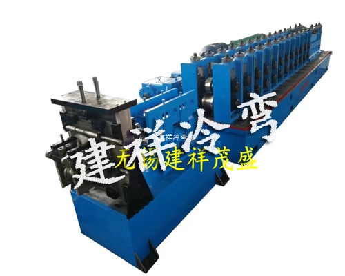 成型主机12架内侧为独立连体闭口式牌坊结构,主机外侧为独立单体闭口式牌坊结构,机械展开宽度为2.5m。牌坊材质铸钢,回火处理。立辊横截面有足够的强度与可靠的质量保证。导向立辊1道。辊轴直径φ100,材料为40Cr钢,调质处理。轴承型号:固定面7216,调节面32216,每道各4件。主机功率55KW,变频调速,ZQ650减速机,速比48.57,一型装配。传动齿轮箱之间用链轮连接,与辊轴之间用齿轮传动轴传动,与减速机之间用2寸双排链传动,设备进料宽度范围100-200mm,设备可同时安装U、V型两套成型模具,分组成型,传动组装在出料口,配成型水冷循环系统,出料口加装防冷却水回流气动喷口,